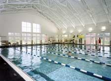 On top of all that, it is a remarkably energy-efficient structure. No mechanical dehumidification is used. Instead, an air-to-air heat exchanger provides dehumidification and preheats incoming makeup air. Therefore, large volumes of air can be exhausted economically and replaced with chlorine-free air. The heat exchanger thus enables the heating system to gain up to 40 degrees Fahrenheit in air temperature. In comparison to a standard system, this one saves more than 50 percent of energy requirements.