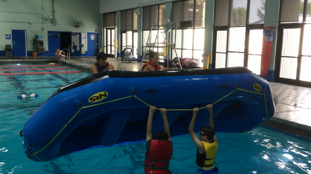 In February, water safety sessions are offered in partnership with the county search and rescue team. “They come in with their rafts and kayaks, and we learn to deal with kids falling out of boats, or we use our water slide [to teach] water safety in moving water,” says aquatic supervisor Sarah Davenport. The objective of this program is to involve parents and kids in water safety education.