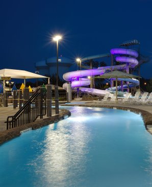 From an early stage, it became clear that two things would take high priority: sustainability and the need to expand in the future. As part of the design team’s forward-thinking approach, it incorporated LED lighting throughout the site, including underwater. Slides and towers are lit by two LED color light towers, which produce up to 30,000 color combinations. On the mechanical side, redundant pumps were used for each venue, as was the capability to add UV sanitation to supplement chlorine and remove microbes. Maintenance buildings were constructed with enough space to accommodate heaters that could be added later. For energy savings, each pool venue has its own circulation system to provide multiple points of filtration and circulation. Variable-frequency drives ensure that pumps only run as hard as they need at any given time. In addition, all areas are ADA accessible, except venues launched from slide towers.