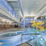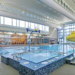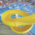 The facility features a combination recreation pool, spa and sauna. Its bright yellow, towering figure-eight water slide is a colorful form among the surrounding blue and white hues. When the slide isn’t