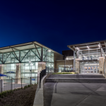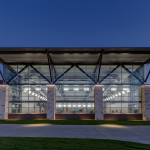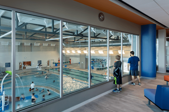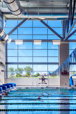 One of the country’s fastest-growing cities made a historic investment to see an aquatic center for its citizens. The substantial structure, covered in windows and glowing with natural light, features a clever traffic layout.