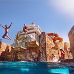 The design and theming are meant to reflect the environs, with the structures crafted to look as if they had risen from the seafloor and onto the palm-shaped, man-made island. Corals and aquas combine the aquatic with desert. On the stone work in Immortal Falls Cliff Jump and Trident Tower, visitors see what appear to be etchings from a lost, ancient civilization. Splasher’s Cove includes aquatic flooring that looks like ocean waves approaching the children’s slides. Medusa’s Lair, with its racing tube slides, features imagery of the mythological figure to add to the overall theme.