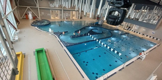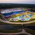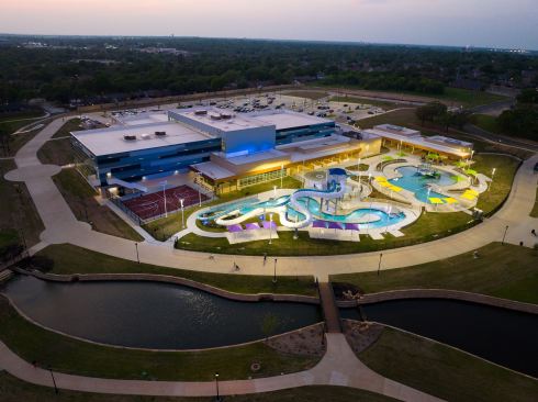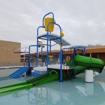 The outdoor waterpark was designed more for fun and recreation. Visitors will find a large lazy river and a zero-depth-entry leisure pool, two splash pads, and two water slides — one of which terminates in a plunge pool that leads to the lazy river.