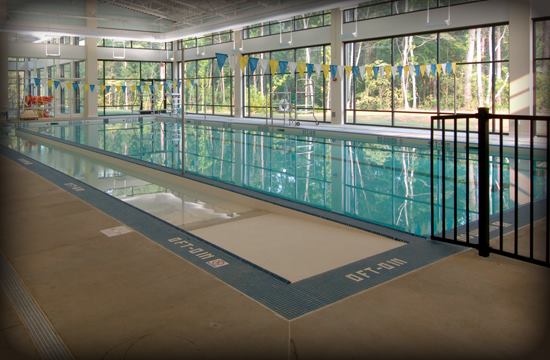Inside, the two pools are separated by glass walls, reducing noise while creating a feeling of open space and allowing daylight to filter through. The glass walls also provide views of the trees and adjacent nature trails.