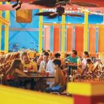 Audio visual systems introduce movies shown on a large screen that doubles as a ship’s sail, offering families entertainment options within the waterpark. Guests can enjoy A&W, Pizza Hut or a drink at the open bar area.