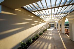 The building footprint is oriented east-west to control solar exposure. In response to the solar orientation, the roof slopes and overhangs to the south to provide much-needed shading in the summer and to accommodate a future photovoltaic panel system. As the roof slopes up in the opposite direction, clerestory windows provide natural light into many areas of the building, taking advantage of consistent northern daylight.