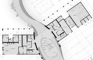 The central administrative hub is an oval form that responds to the organic nature of the Riverwalk as well. This strong architectural element houses offices, the lobby and a lifeguard room that utilizes its form to maintain visual contact with the pool deck. Pool users follow the undulating walk through the lobby, out to the pool deck, terminating at the prominent slide tower.