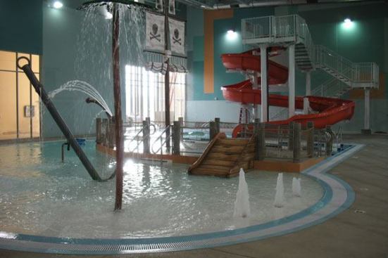 The recreation pool offers nearly 2,400 square feet of warm and shallow water for play, exercise and a little soothing relaxation at the underwater jet bench. Themed as a playful pirate area, the recreation pool includes a zero depth beach, a raised ship wreck play area with sprays and a small slide, cannon sprays, a pirate flag dumping spray device, a water slide, and 3 lap lanes.