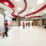 For the color scheme, the team drew primarily from a calming, water-leaning palette of grays, white and a gradation of blues, seen in the ceiling, wall panels and ceramic tile decking. But this is no easygoing color story, as accents in the team’s red jolt visitors into school spirit.