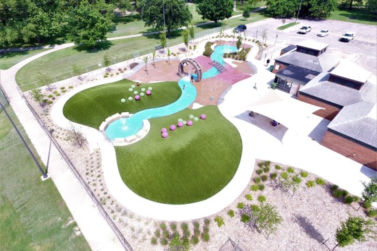 Natural limestone blocks around the edge provide seating for supervising adults and walkers taking a break. The team used landscape beds where they could, focusing on more resilient and hardy plants that require little upkeep.