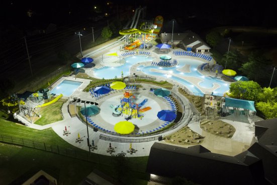 The city facility gained several new attractions so it could serve as the community waterpark. A 3,500-square-foot children’s pool features a large, multilevel aquatic play structure. A 4,900-sq. ft. leisure pool is enhanced by a large, shaded water lounge. The 5,600 sq. ft. lazy river contains a beach entry and underwater seating alcove. Body flume water slides drop into a dedicated 1,100 sq. ft. plunge pool.