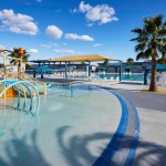 Underwater and overhead lighting allow for night-time events. Multiple chair lifts and walk-out stairs make the pools widely accessible.