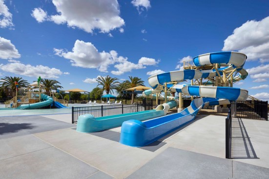 Blues, greens and tans were used on the pools and slides to enhance the tropical vacation theme. Exotic plants such as palm trees, along with rich building materials such as stone and colored concrete, reinforce the resort vibe.