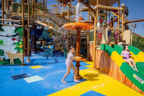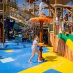 Next to the dominating play structure ambles a lazy river with swim-up bar, providing an area for adults to relax.