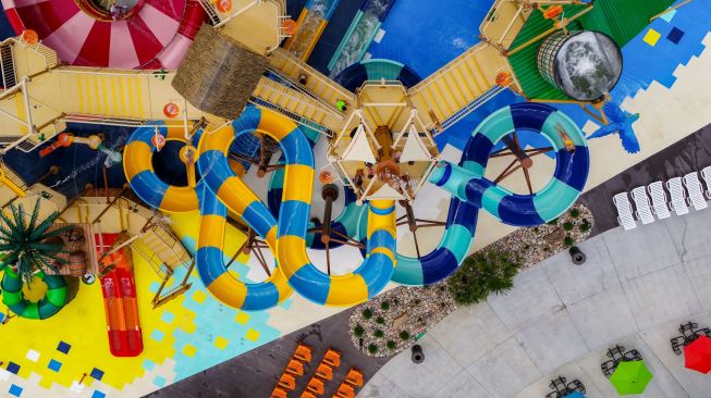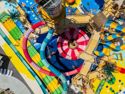 The slides at the top of the structure are reserved for those who meet the height restrictions, making it something of a right of passage for older children and teens. Inside the enclosed tube slide, adventurous individuals can enjoy amped-up visual effects that create glowing stripes and polka dots.