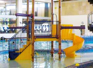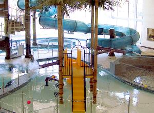 The 16,970-square-foot aquatics center features two pools, one hot tub, two lazy rivers, three vortex pools, three water slides, and two sets of water-playground equipment, with amenities split evenly between indoor and outdoor spaces.