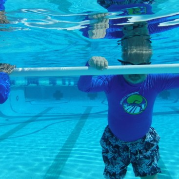 These adults also can venture to the very end of a rail, placing them in the center of the pool. From here, they can climb down the rail’s vertical post until they reach the bottom. Keeping a loose hold on the post, they can feel the water push them up to the surface.