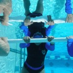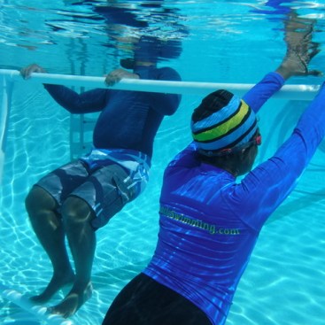 For many, just getting out into the middle of the pool, far from terra firma, is a tremendous feat. To see them actually enjoying themselves, playing in water over their heads, is a sight to behold. What’s even more incredible is watching them learn basic swimming skills. Kicking off from the sidewall, they can reach the rail easily from short distances. As they work up their confidence, they can start farther and farther from the rail, until they’re swimming freely in deep water.
