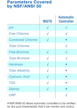 Automatic controllers also undergo chemical resistance testing, setpoint actuation testing and operational protection testing to verify the accuracy of the readings and that the controller is able to correctly turn equipment on and off based on those water readings. NSF/ANSI 50 does not have L1, L2 or L3 accuracy ratings for automatic controllers, which all must meet the same minimum level of accuracy based on the specific parameter being tested. Automatic controllers can be certified for pH, ORP, FAC/total chlorine and free/total bromine, but NSF/ANSI 50 allows for the testing of additional parameters.