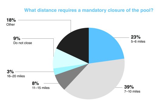 Closure distance: Mandatory closure distances varied among respondents who used storm-tracking technology. About 40% of this group remove swimmers from the water when a storm is 7 to 10 miles away, while 22.5% require closure when a storm comes within 5 to 6 miles. A smaller number implement closure at greater distances, allowing more time for patrons to seek shelter: 11-15 miles (8%) and 16-20 miles (3%).