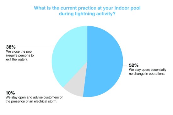 Indoor pools: While many in the industry believe that indoor pools close during storms, respondents indicated otherwise. Nearly 62% of the 174 indoor-pool operators surveyed indicated that they stay open during electrical storms: 52% stay open with no change in operations while 10% stay open and warn patrons of the storm’s presence. Only 38% of indoor-pool operators required swimmers to exit the water.