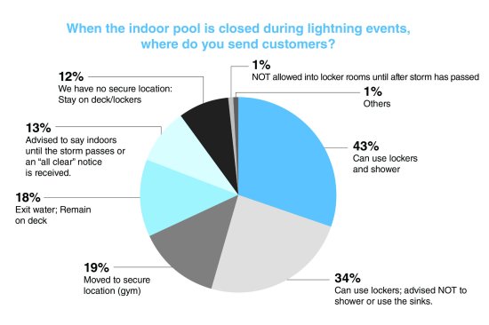 Where swimmers wait: Of the indoor pools that clear the water during electrical storms, a surprising 43% allowed patrons to use showers and sinks, where 34% allowed locker-room use but advised against using showers or sinks. Only 13% of those who remove swimmers from the water advise them to stay indoors until the storm passes. Nearly 18% indicated that swimmers were allowed to remain on the pool deck, with 12% saying there is no other place to go at their facilities other than the pool deck or locker rooms.