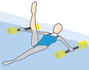 The safest way to address the lack of control when attempting a back extension from a floating position is to keep the balls of the feet anchored to the pool bottom. Forward flexion can be achieved in the floating position by folding the body into a pike position, reaching for the toes with handheld buoys.