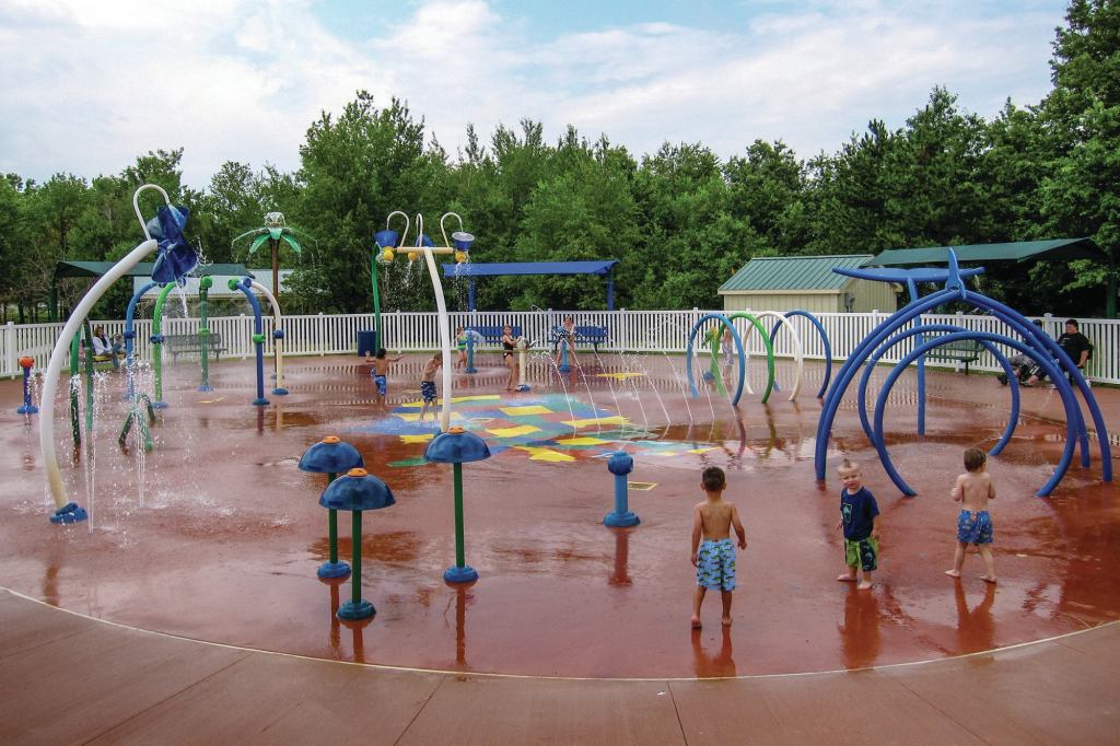 Then: The Kids Love Recreation (KLR) Splashpad at Michigan’s Seymour Lake Township Park was the brainchild of the late Virginia Britton, then president of the Oxford Rotary. With her urging, and under the direction of Oxford’s Parks and Recreation Director Ron Davis, the project quickly became a communitywide effort. Funds raised by Oxford’s Kiwanis, Lions, and Rotarians supplemented a state grant and private donations to make construction possible in 2008, at a total cost around $440,000. From the beginning, the project was envisioned as being universally accessible. Waterplay features can be activated by children using wheelchairs, and water-safe wheelchairs are available at the park. A brightly colored map of the U.S. imprinted on the park’s surface not only provides a fun geography lesson, but is stimulating for autistic children. The park also has a dry playground, as well as ample space for picnics and a concession. In addition to universal access, the KLR Splashpad also serves the greater community in other ways. The spray water is fresh well water, minimizing the risk of any infectious outbreaks, and wastewater is captured in a holding pond and used for irrigating four nearby ball fields and as a backup supply for the local fire department. In the wintertime, the pond becomes a community ice-skating rink. When the judges chose the KLR Splashpad in 2010, the park’s popularity had grown so quickly that the staff had implemented a clever “traffic control” system to ensure that the children had a fun, safe experience. On busy days, children are issued a red, yellow, or red bracelet — like the colors on a traffic light. Children know that it’s their turn to play when their color is flashing.