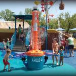 The facility features several amenities for families to escape Kentucky’s hot summer days. The centerpiece is a 20-foot-long, 25-foot-high fishing boat play structure that includes dump buckets and spray features on the deck; two kid-sized slides running off the stern; a geyser that erupts from the mast on a timed basis; an interactive jet spray launcher; and a series of themed crates and barrels where kids can push buttons and pull ropes to trigger various sprays and splashes.