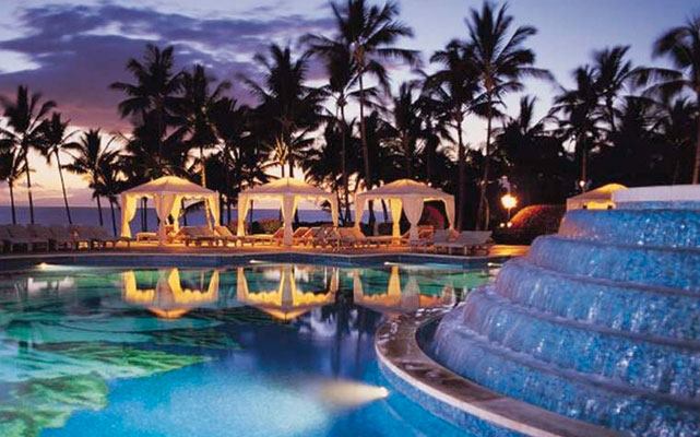 Grand Wailea’s featured pool complex, the Canyon Activity Pools, is a series of nine pools connected by a river. The complex includes a “baby beach,” seven water slides, waterfalls, caves, white-water rapids, grottos, whirlpool and sauna, and the world’s first water elevator.