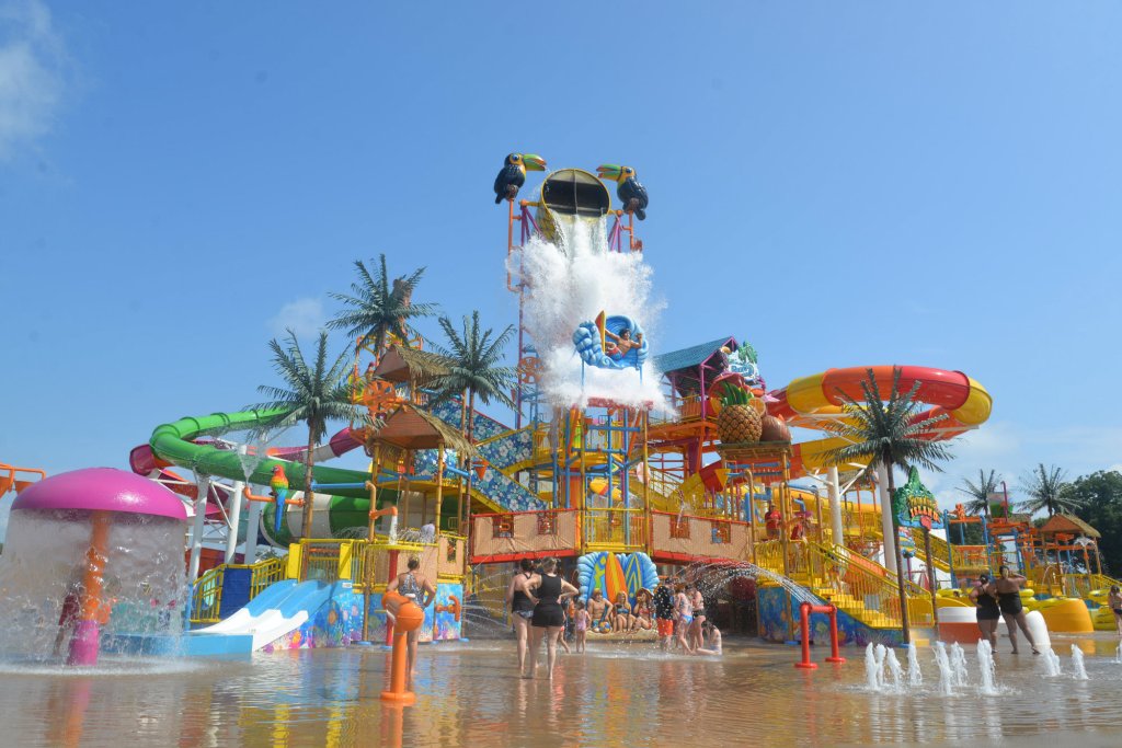 This innovative water play structure features more than 80 interactive features and 10 water slides.