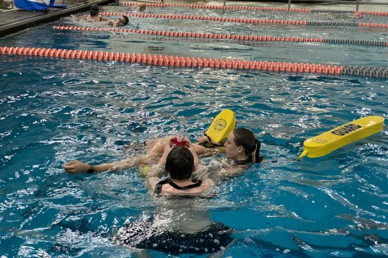 Objective: Both lifeguards secure the victim with one rescue tube and tow victim to the side of the pool.