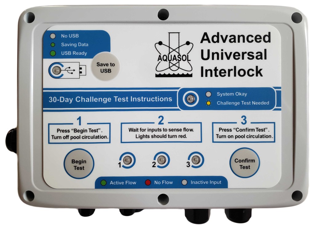 The Aquasol Advanced Universal Interlock (AUI) is a multi-layer electrical interlock system that immediately disables chemical feeders when low or no flow is detected in bodies of water. This safety device helps prevent swimmer injury caused by unintended chlorine gas creation. Easy to install and retrofit on existing equipment.