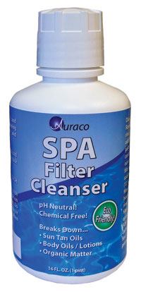 Auraco’s new pH neutral and chemical-free Spa Filter Cleanser removes dirt, lotions, body oils and organic contaminants.